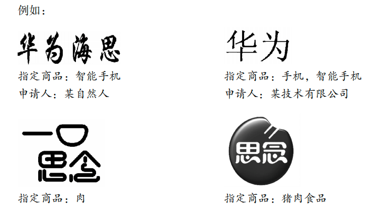 《指南》里面列举了两个例子“华为海思” 和“华为”,二者都在指定商品智能手机上使用;“一口思念”和“思念”都在指定商品肉类上使用,“华为”和“思念”都是在先具有较高知名度的商标,“华为海思” 和“一口思念”在相同商品上使用极易使相关公众认为属于系列商标而对商品来源产生混淆,因此判定为近似商标。
